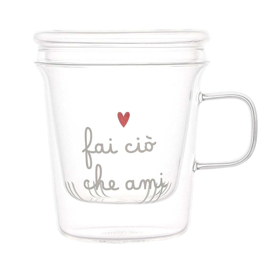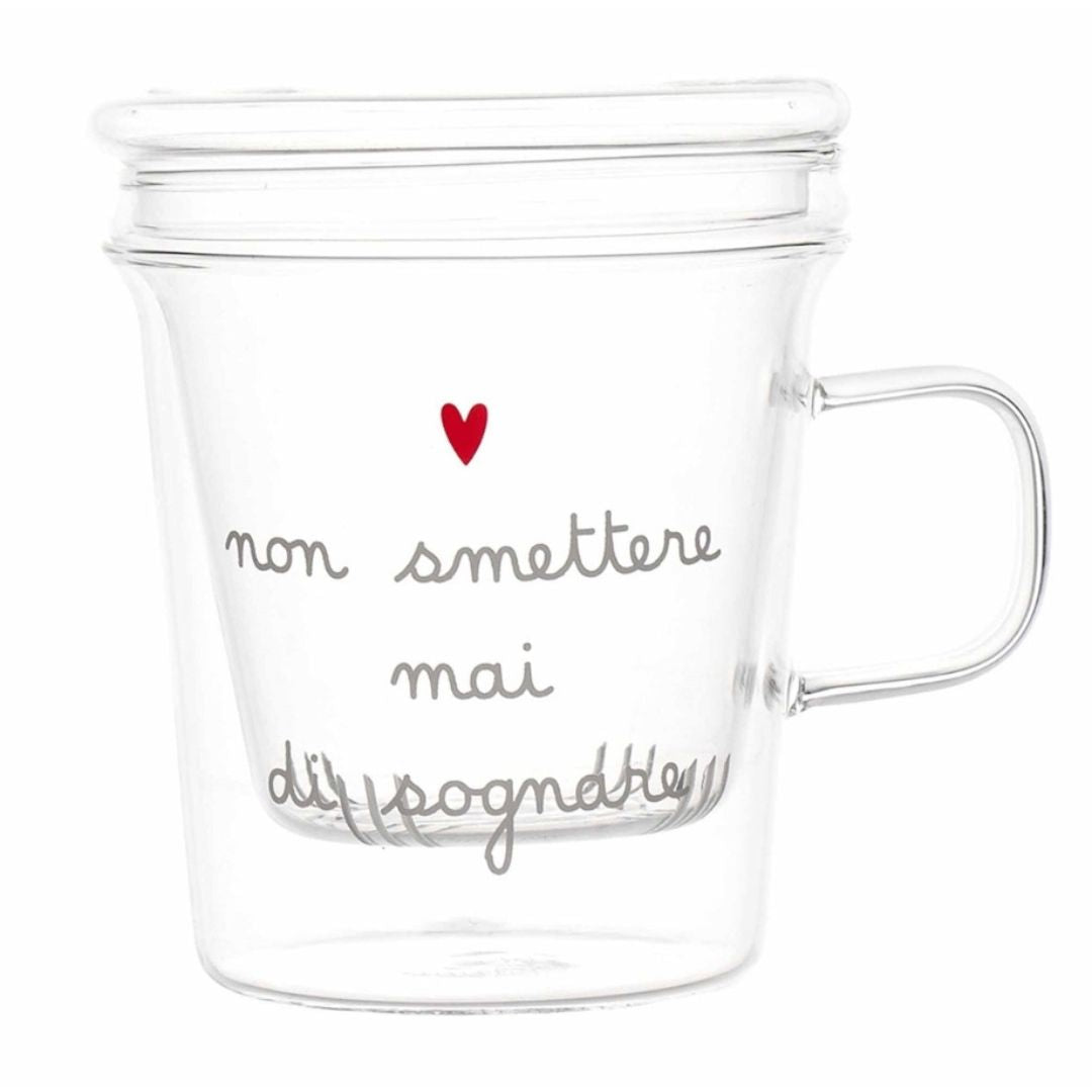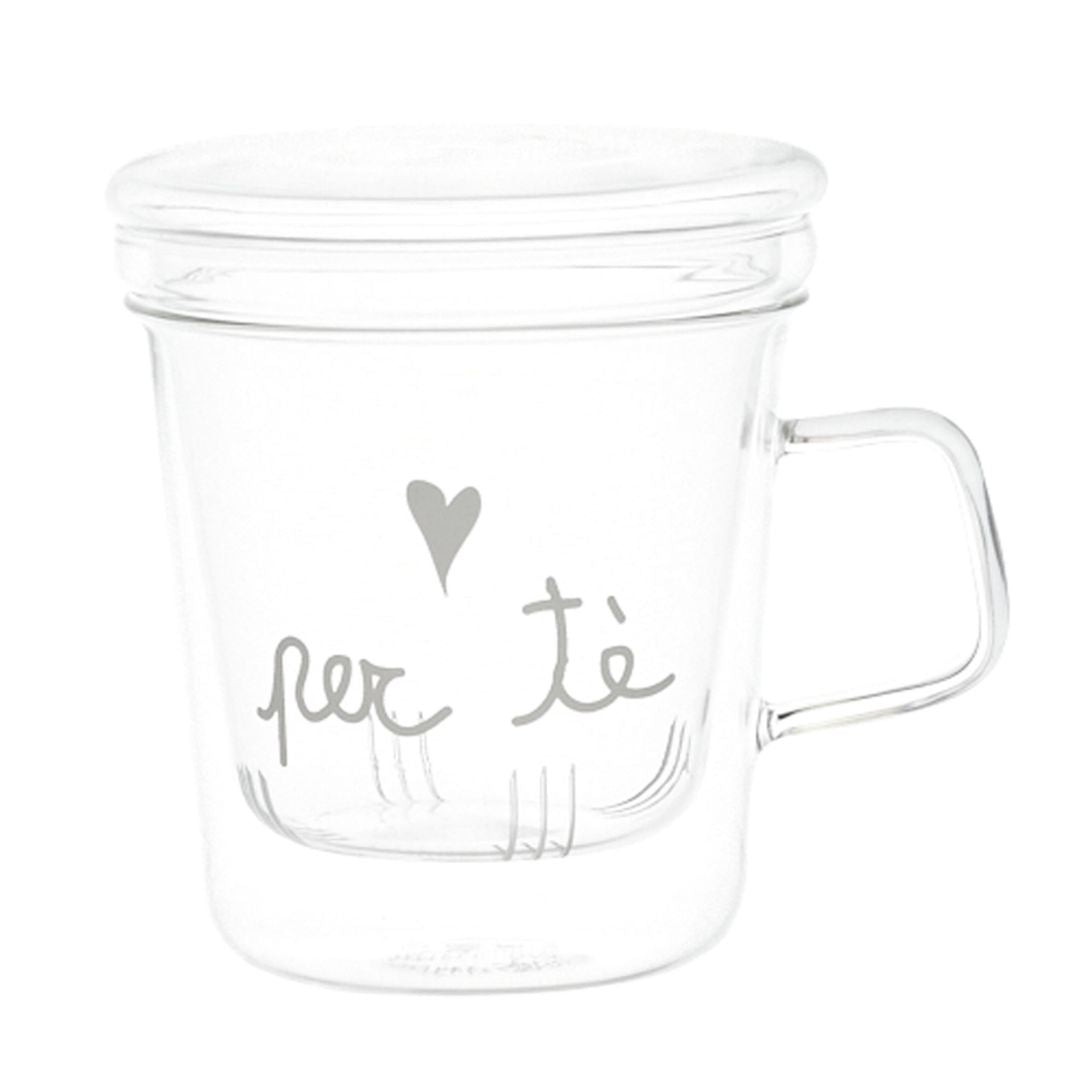Mug in vetro borosilicato con infusore e scritta serigrafata bianca.