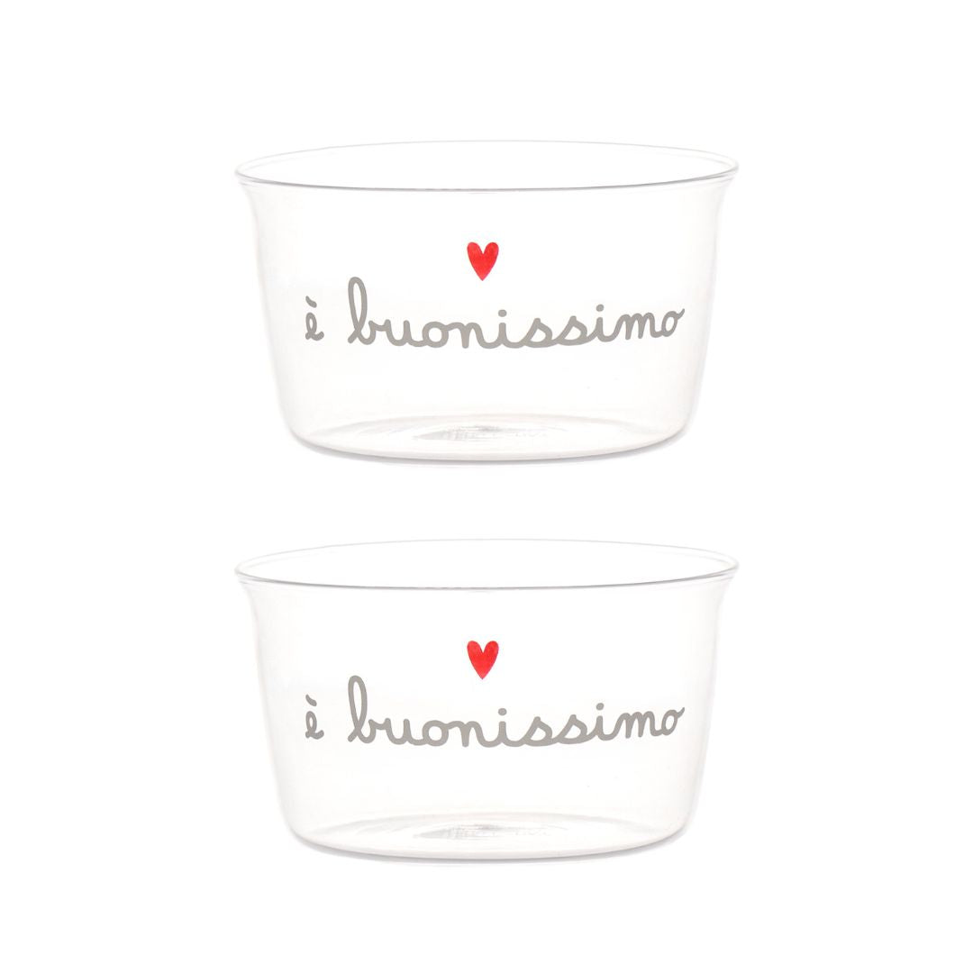 Set di 2 coppette in vetro borosilicato con scritta serigrafata bianca.