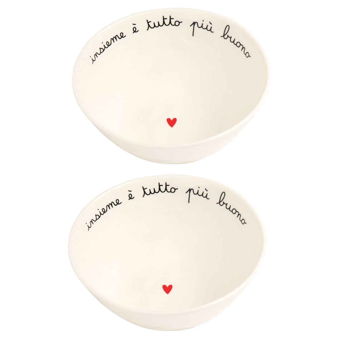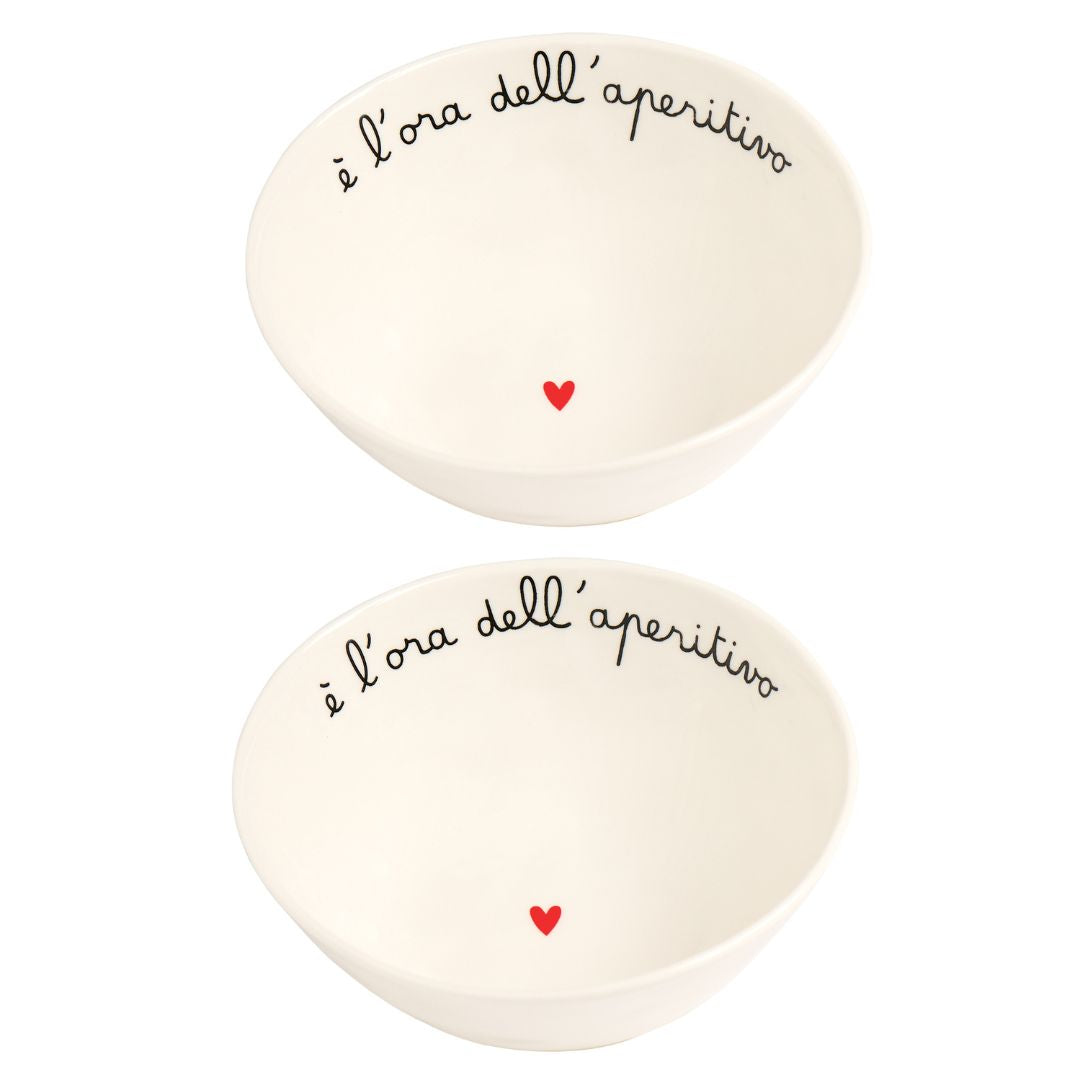 Set di due ciotole in gres con scritta "è l'ora dell'aperitivo" e cuoricino rosso.