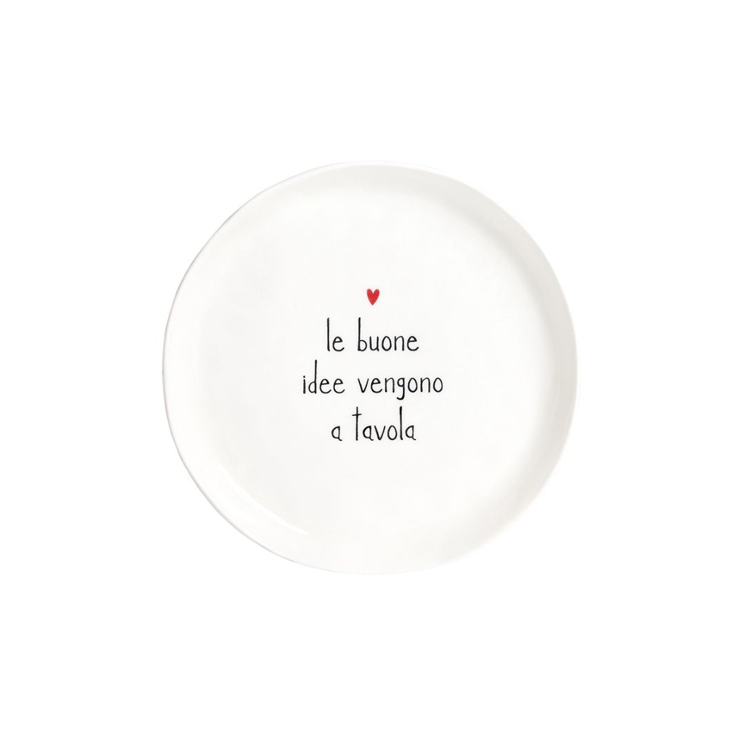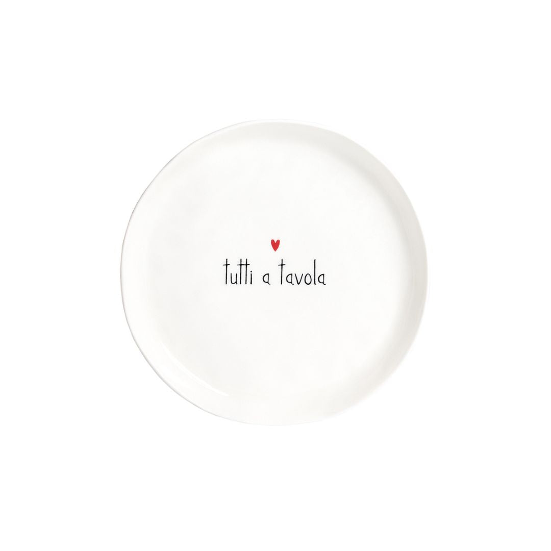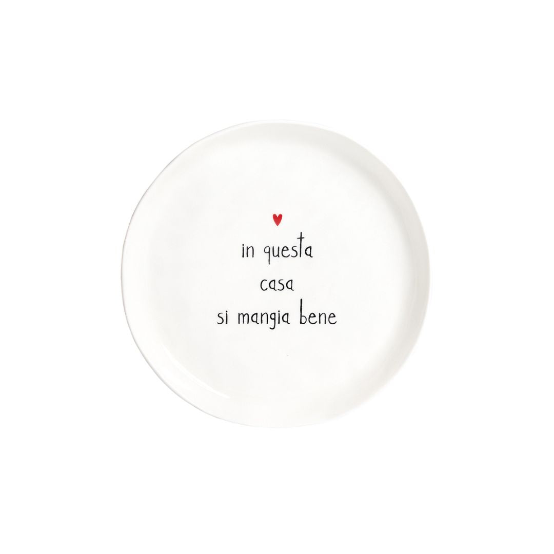 Piatto da dessert con diametro di 21 cm in gres con scritta nera "in questa casa si mangia bene" e cuoricino rosso.