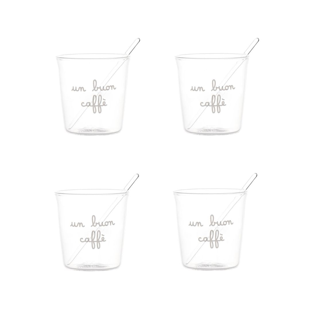 Set di 4 bicchierini espresso in vetro borosilicato con palettina inclusa.