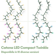 La Catena Led Compact Twinkle è progettata per un utilizzo esterno ed è disponibile in diverse lunghezze e configurazioni di LED. Ogni versione offre un effetto twinkle con 8 giochi luminosi, garantendo un'illuminazione perfetta per tutte le occasioni natalizie.