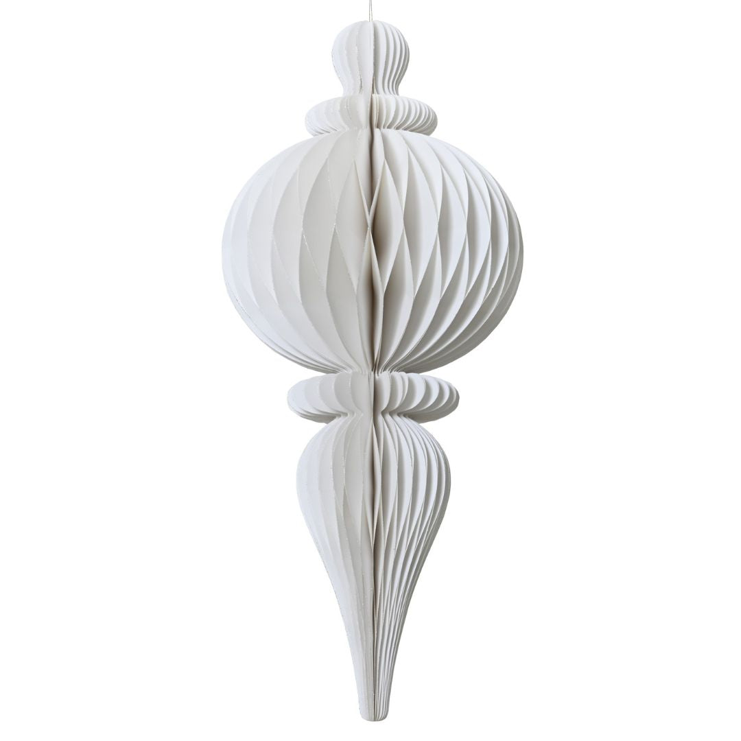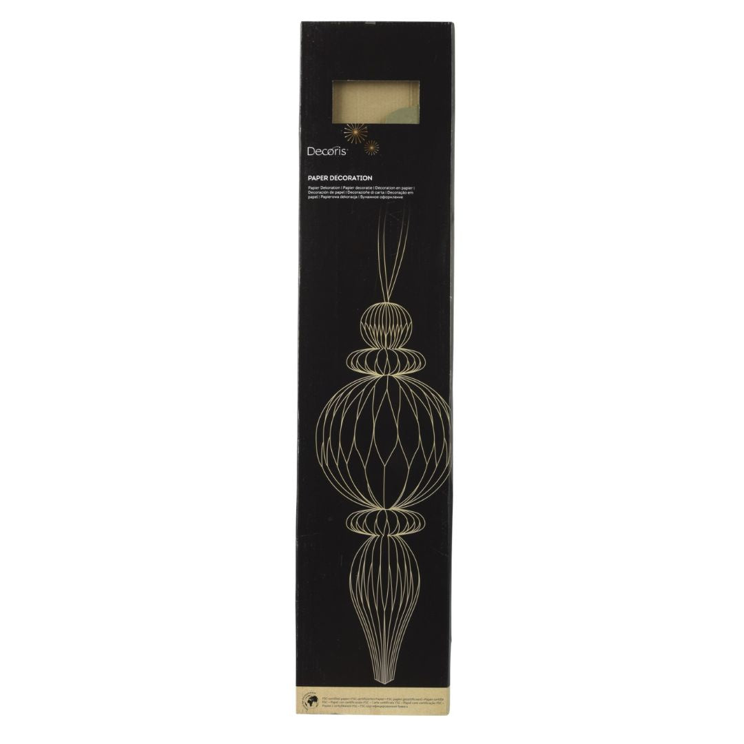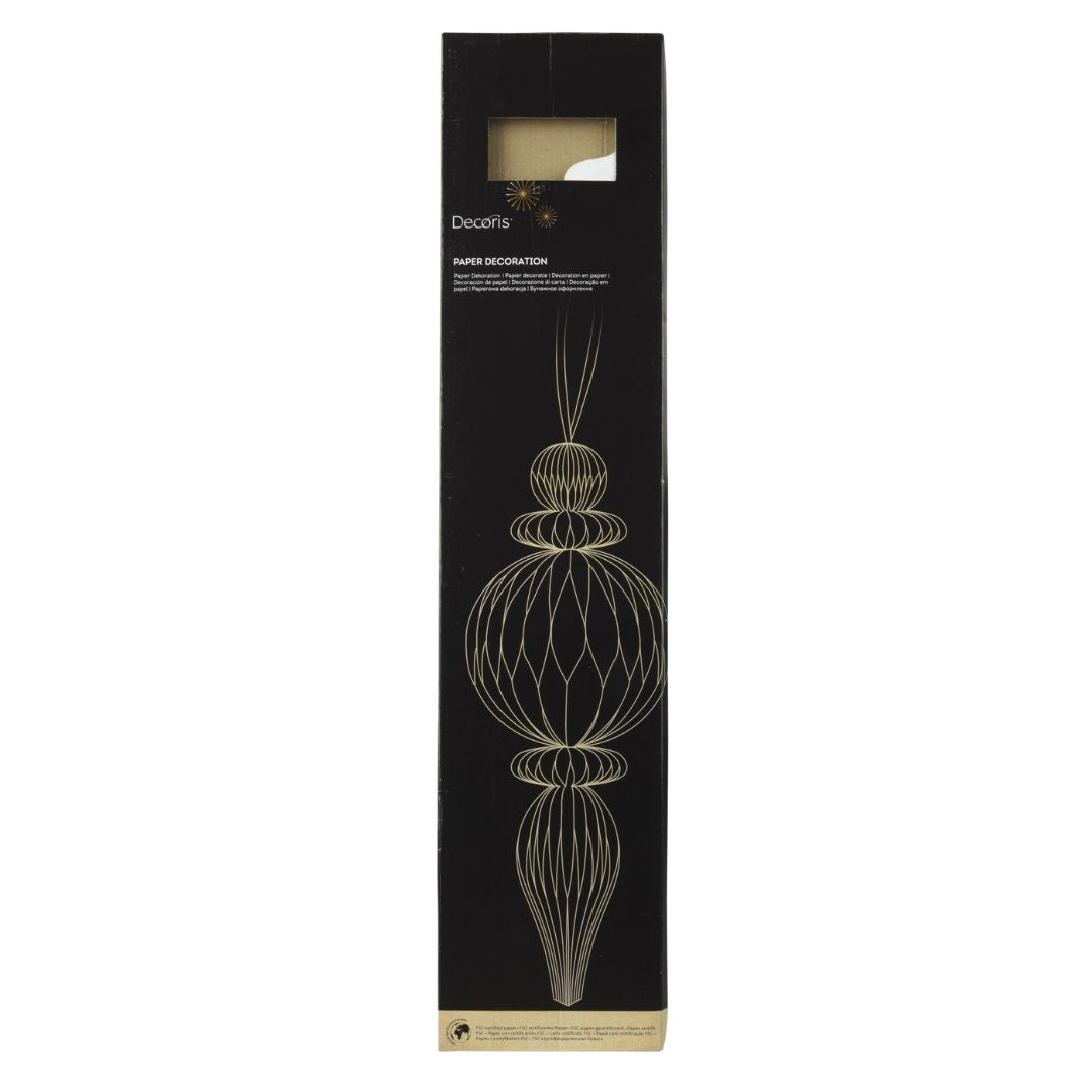 Decorazioni sospese natalizie in carta, altezza 80 cm e diametro 34 cm. Leggere e raffinate, sono disponibili in tre colorazioni con finitura champagne o glitter oro. Ideali per completare decorazioni a tema naturale o per valorizzare ambienti ampi con un effetto elegante e luminoso.
