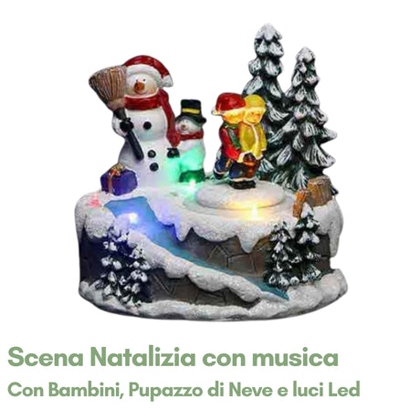 Scena Natalizia di Bambini e Pupazzo di Neve con Led e Musica