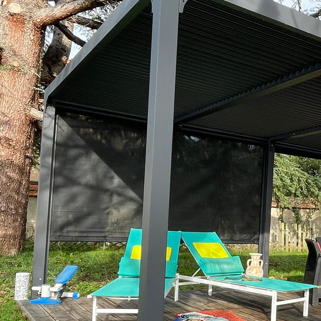 Puoi installare facilmente 2 tende nel lato da 6 m della tua pergola bioclimatica Habrita così da garantirti la massima protezione da sole e vento e una adeguata privacy.