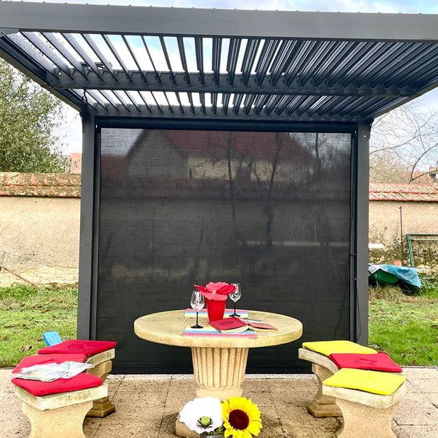 Tenda laterale avvolgibile manualmente per lato da 2,4 m in PVC intrecciato grigio chiaro per Pergola Bioclimatica 2,4 x 3 m in Alluminio Grigio Antracite.