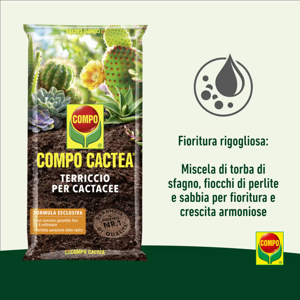 Il terriccio Compo cactea è ideale per tutte le cactacee e le piante grasse in genere. La sua speciale composizione permette un’equilibrata concimazione garantita per 4-6 settimane, favorendo una fioritura rigogliosa e una crescita armoniosa sia della parte aerea che dell’apparato radicale. La struttura porosa, ottenuta dalla miscelazione di torba di sfagno, fiocchi di perlite e sabbia, contribuisce a migliorare il drenaggio e a ridurre il rischio di ristagni d’acqua, particolarmente dannosi per questo tipo di piante.