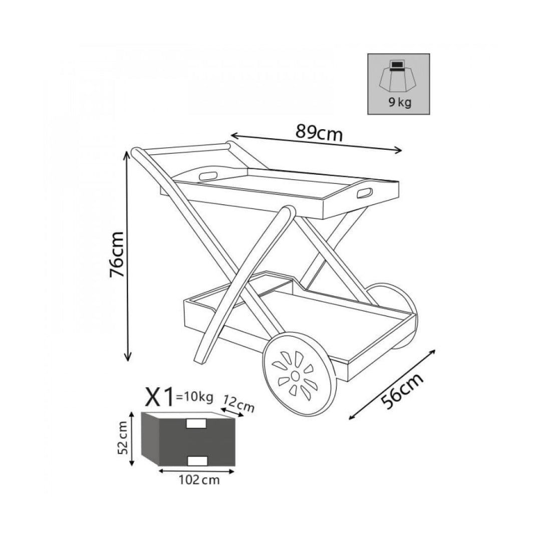 Un comodissimo carrello bar per servire cibo e bevande ai vostri invitati. Facile da spostare e direzionare grazie al suo solido manubrio. Lo spessore delle due ruote non conosce ostacoli, soprattutto negli spazi all'aperto. Due ampi e capienti ripiani – uno superiore, l'altro inferiore – permetteranno di riempire questo trolley bar con ogni tipo di prodotto da servire, bottiglie comprese. Il suo design classico lo rende adattabile a qualsiasi ambiente della vostra casa sia esterno che interno.