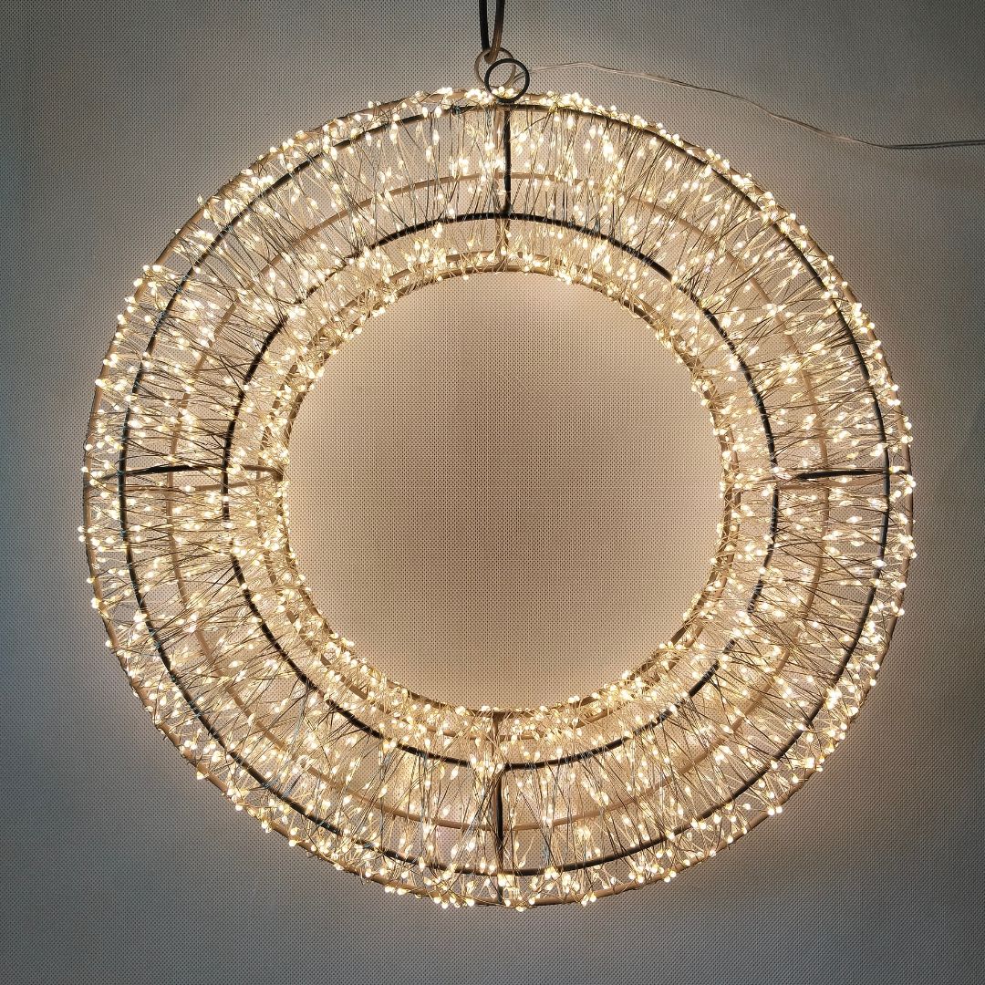 Le corone luminose in metallo dorato sono dotate di migliaia di micro LED a luce calda classica, disposti fittamente lungo una struttura a filo metallico color oro. Il timer automatico e la qualità dei materiali rendono questi decori ideali anche per installazioni professionali.