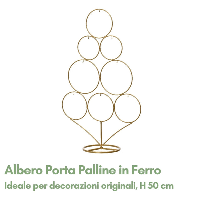 L'Albero di Natale Portapalline è realizzato in ferro resistente con una finitura dorata a polvere. Il design a cerchio è pensato per ospitare e mettere in risalto le decorazioni natalizie, offrendo una soluzione elegante e pratica per la tua casa durante le festività.
