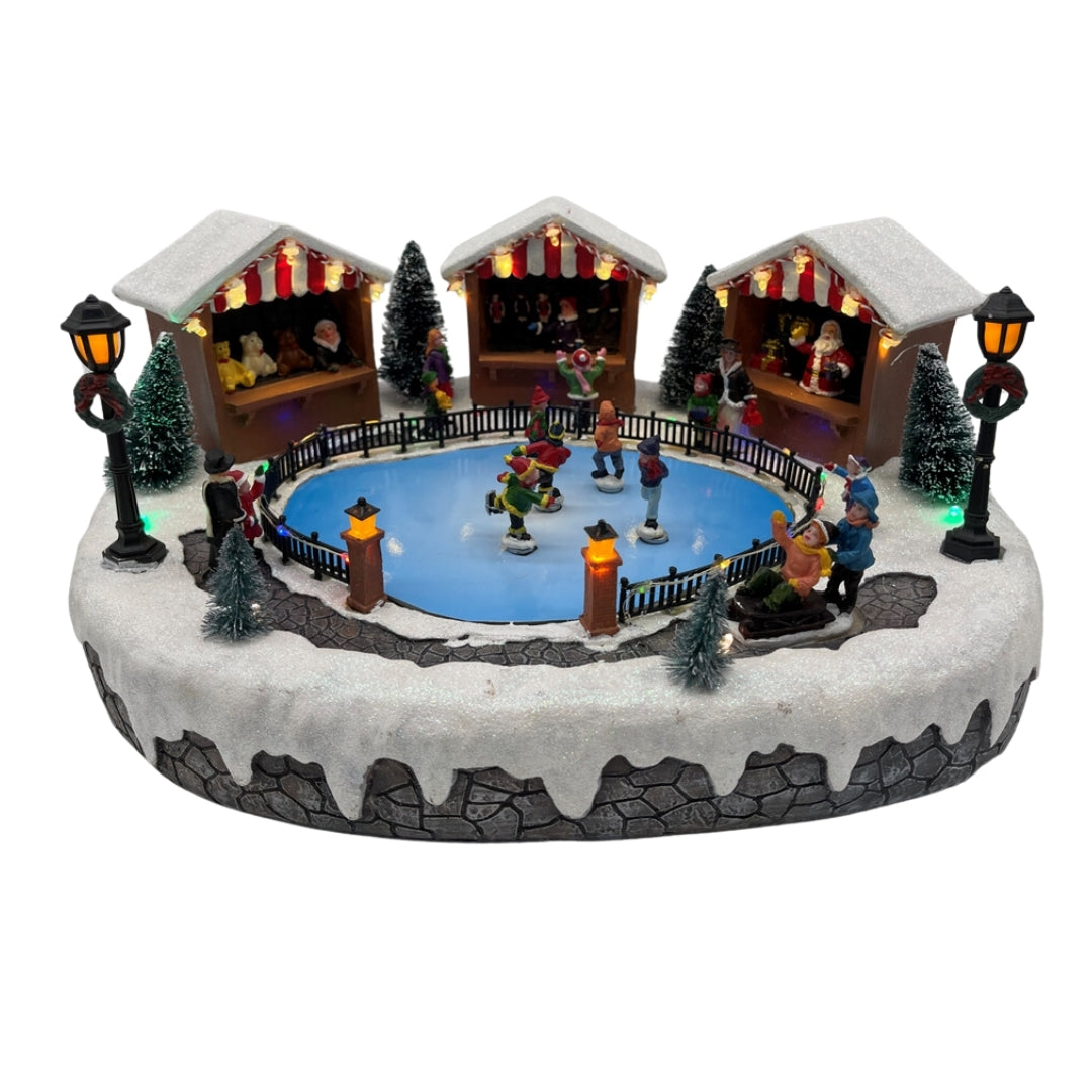 Villaggio natalizio con pista di pattinaggio su ghiaccio, illuminato da luci LED e accompagnato da musica natalizia. Alimentato tramite adattatore 4.5V (incluso).