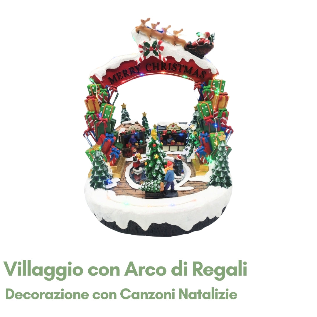 Villaggio natalizio con arco di regali, illuminato da luci LED e accompagnato da musica natalizia. Alimentato con adattatore 4.5V (incluso) o 3 batterie AA (non incluse).