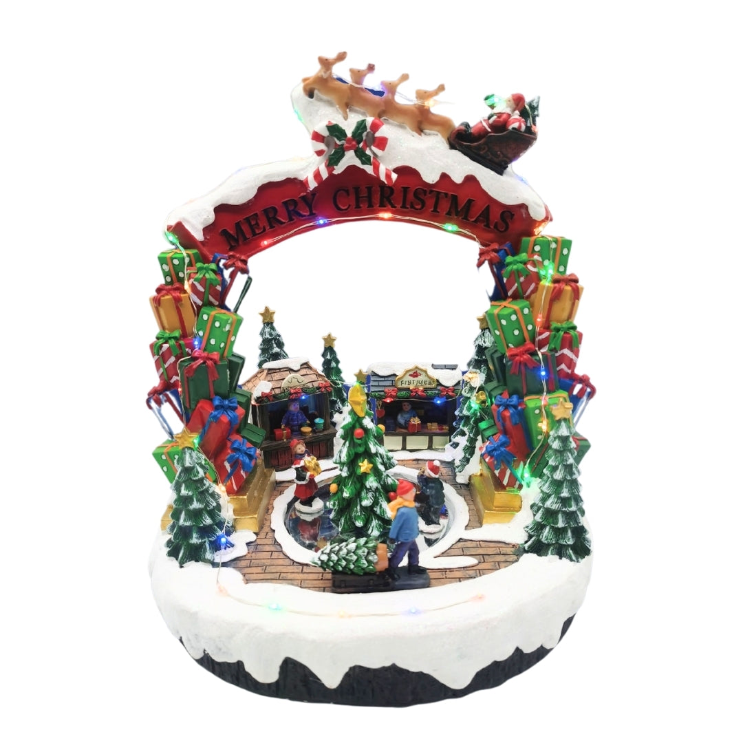 Rendi il tuo Natale ancora più speciale con il Villaggio di Natale con Arco di Regali a LED e Musica. Questa decorazione incantevole presenta un villaggio festivo con un arco di regali illuminato e bambini che ruotano intorno all'albero, tutto accompagnato da dolci melodie natalizie.