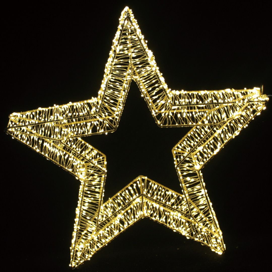 Stelle decorative in colore oro, realizzate con struttura a rete illuminata da una fitta trama di micro LED. Fornite con adattatore da 24V e cavo da 5 metri.